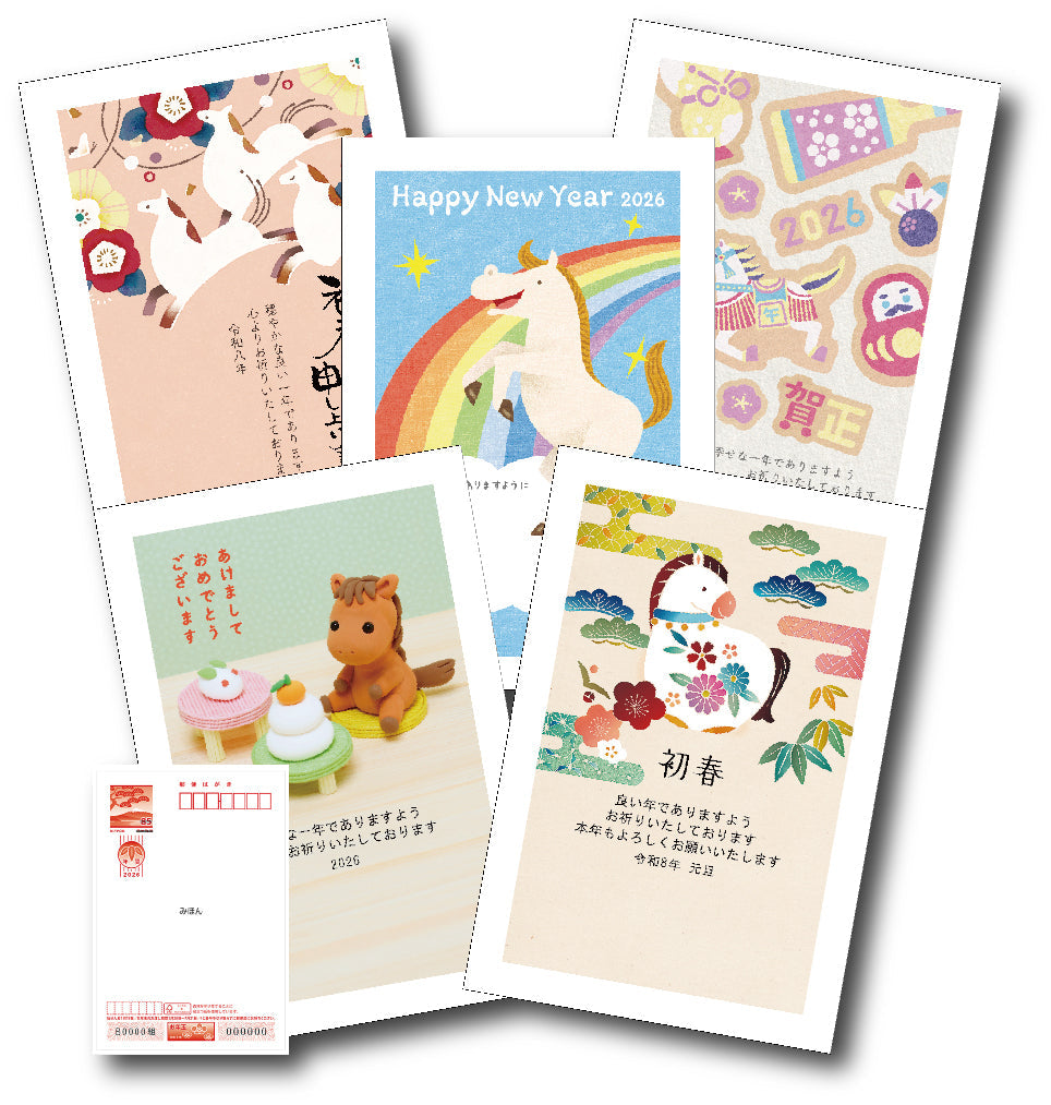 令和8年 (2026年) 用 午年 パック年賀状 郵便局で発売している 2026(令和8)年用年賀はがき(お年玉付き)に(株)ハッピーオリジナルデザインを印刷した年賀状です。