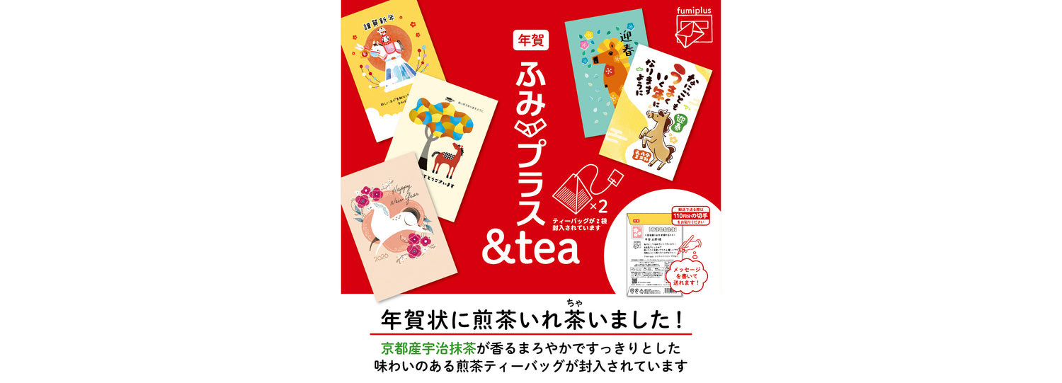 ふみプラス&teaシリーズはパッケージ(ハガキサイズ)に直接メッセージを書き切手を貼りポストに投函し年賀状としてお使い頂ける商品です。