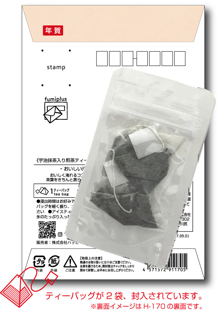 封筒内には京都府産宇治抹茶が香る、まろやかですっきりとした味わいのあるティーバッグです。【宇治抹茶入り煎茶ティーバッグ】が2個入っています。