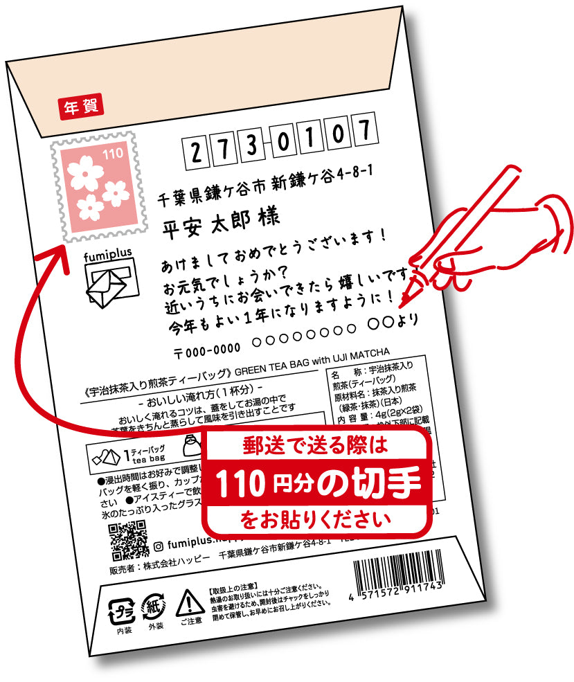 ふみプラス&teaシリーズはパッケージ(ハガキサイズ)に直接メッセージを書き切手を貼りポストに投函し年賀状としてお使い頂ける商品です。